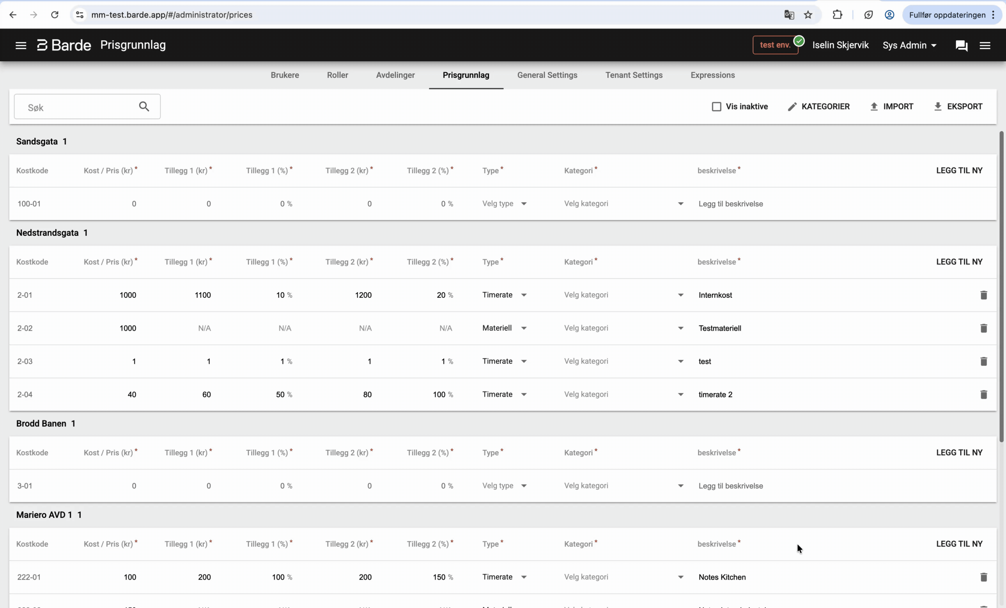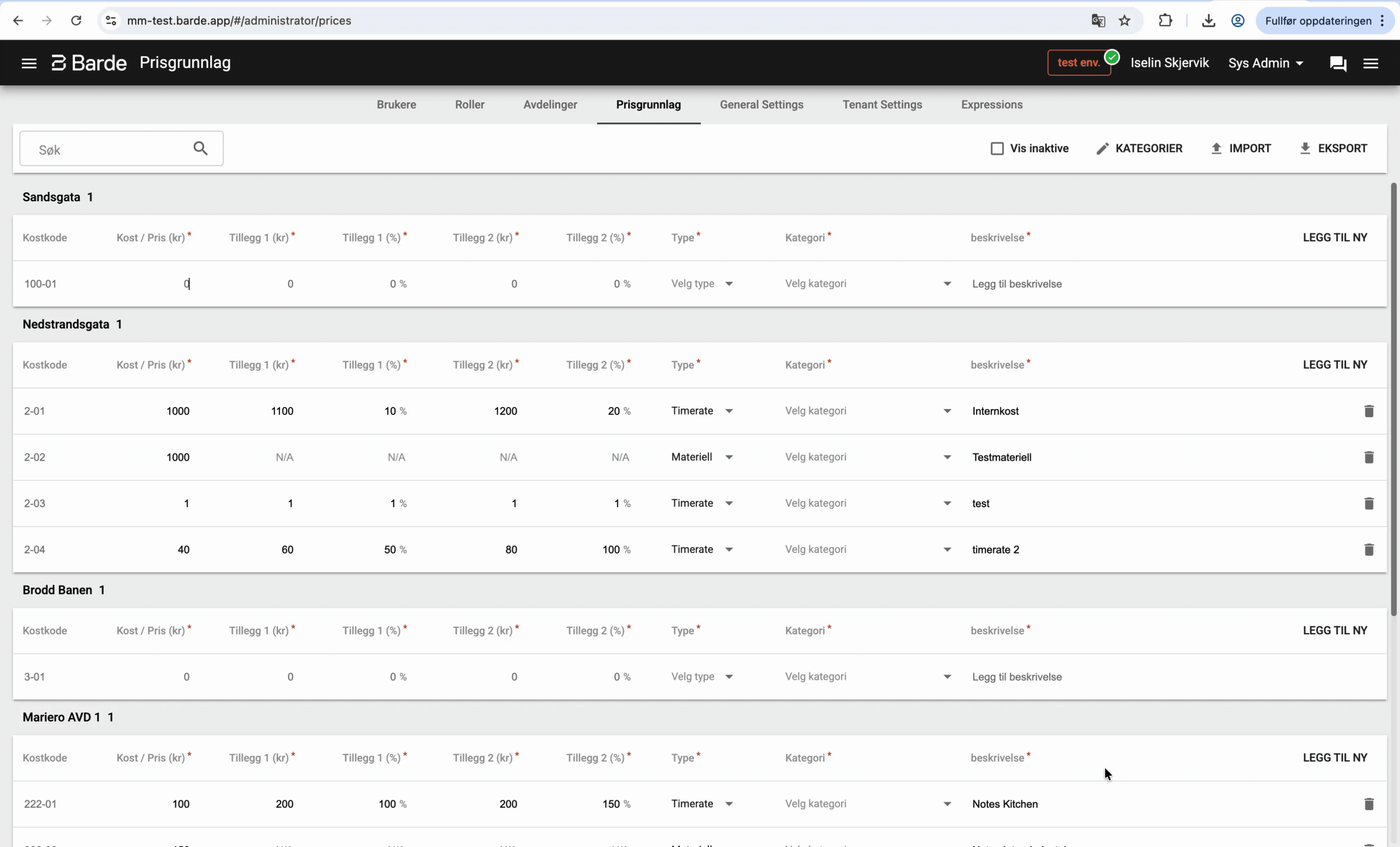 Etter at kategoriene er opprettet, må du definere priser og kostnader per avdeling.